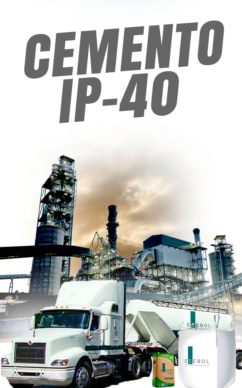 Cemento ECEBOL, es un cemento categoría resistente Alta, en el caso de IP-40 (40 MPa) y IP-30 (30 MPa) de resistencia mínima a la compresión a 28 días según la Norma Boliviana NB-011. Está elaborado bajo estrictos estándares de la industria cementera, fabricado a base de clínker de alta calidad, puzolana natural, esta mezcla es molida industrialmente en molinos de última generación, logrando un alto grado de finura.
